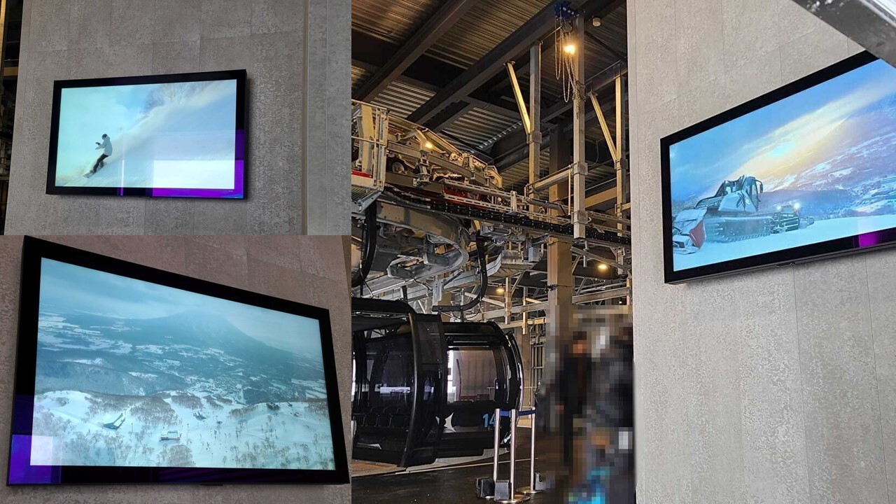 1台は広告配信を中心とした画像・動画ファイルの放映や利用案内、1台はリフト・ゴンドラの運行状況やライブカメラ映像の配信といった施設情報の配信を実施し、利用者へのタイムリーな情報配信を実現。