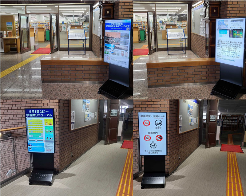 店内ディスプレイ×3面の他、店内から店外に向け通行人に対しての店舗案内用に1台の計4台設置。
