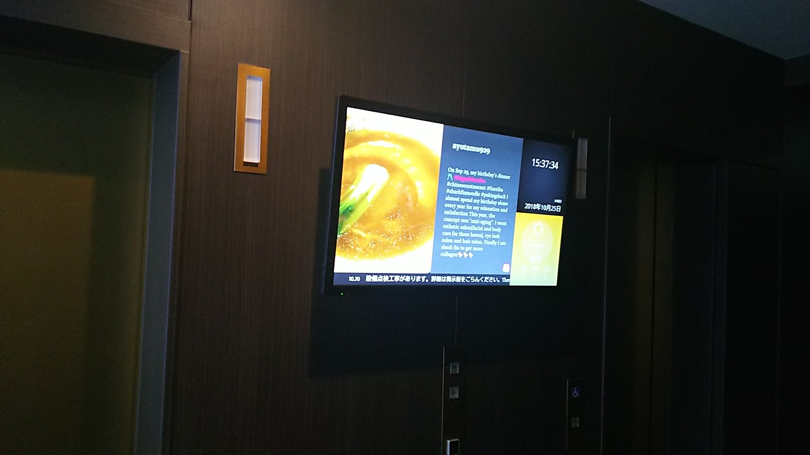 施設管理者からのアナウンスに加え、地域の自治体のTwitter情報を連携表示。天気やニュース、地域商店街の口コミ情報など、居住者向けサービスの一環として運用。